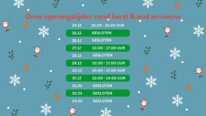 Tijdens de feestdagen hanteren wij aangepaste openingstijden. In de afbeelding hierboven vind je een overzicht van wanneer je bij SnuffelmugMeer lezen over “Aangepaste openingstijden tijdens de feestdagen” - Winkels gesloten op16 december